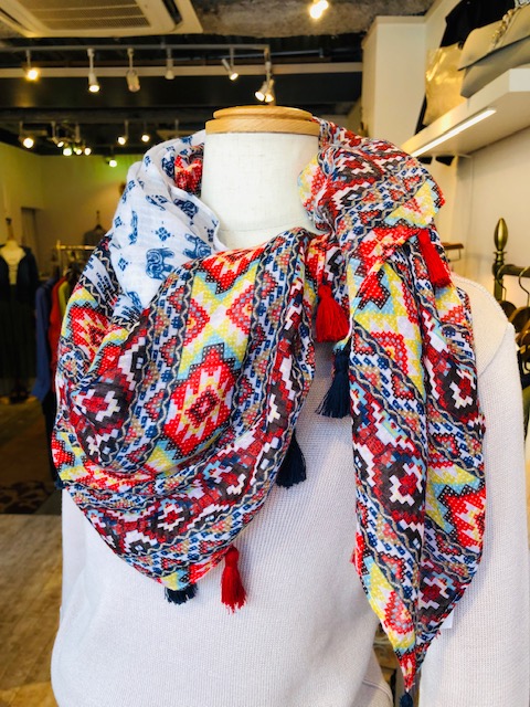 春ストール 5900円💕 お洒落なエスニックプリントのストールはいかがでしょう?大判で薄手なので、真夏の日焼けよけにもお使いいただけます💕😍 可愛いフリンジとエスニックなプリントが素敵なストールです💕 2019年3月17日