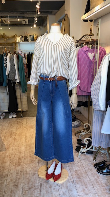 ワイドデニム 13800円💕 ストレッチで履きやすいワイドデニム💕 フロントの色褪せ加工で着こなしに立体感が出来る嬉しいパンツです⭐️😍 白いブラウスやテイシャツ など、トップスの雰囲気で万能に変化できるヘビロテアイテムです💕 2019年3月17日