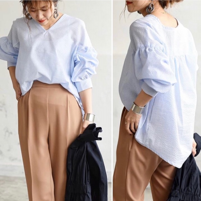 水色のブラウス 6900円💕 お袖ボリュームのサッカー素材のブラウスです💕洗ってみましたが、気になるシワはつかずに新品同様の仕上がりになりました⭐️⭐️⭐️😆 お色違いも欲しくなる一品です💕 こちらは、薄いラベンダーもございます 2019年3月17日