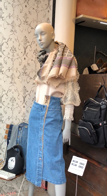 デニムコーディネート 💕 大人気の袖レーストップスとデザインタイトスカート、アクセントにエスニックなストールを合わせてみました💕 ストールが大判なので、春の寒の戻りの寒さ対策にもお役立ちですーーーっ💕💕💕 ストール 5900円 レーストップス 6900円 デニム 9800円 2019年3月19日