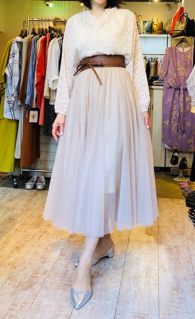 レオパードプリントのブラウスとチュールスカート💕 透かし模様のレオパードにベージュのチュールスカートを合わせたコーディネートはいかがでしょう?💕チュールスカートが一枚あると、Tシャツでもブラウスでも、着こなしの幅が広がりますよぉ〜⭐️⭐️⭐️ チュールスカート 7900円 レオパードブラウス 12000円 本革ベルト 5900円 2019年3月31日