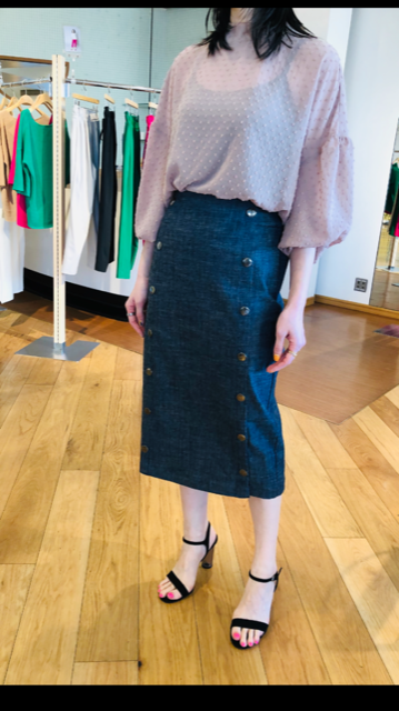 ドットレースブラウス 13000円💕 上品なドットレースの生地を使ったお洒落なブラウスは、お袖のボリュームとバックリボンのデザイン🎀となっております🌸😊 ありきたりなブラウスに飽きた貴女に、、、 クールなスキニーデニムとかに合わせて甘辛ミックスを楽しむのもGOOD⭐️⭐️⭐️👌 デニムタイトスカート 12000円💕 2019年3月31日