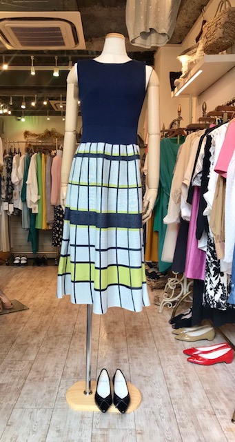 格子柄ニットワンピース💕15000円 上質なコットンにシルク混紡のサマーニットワンピースが到着しました💕😃上半身はネイビー、スカート部分はイエローのとってもステキな配色となっております💕😍👍 フラットシューズ 9800円 2019年4月30日