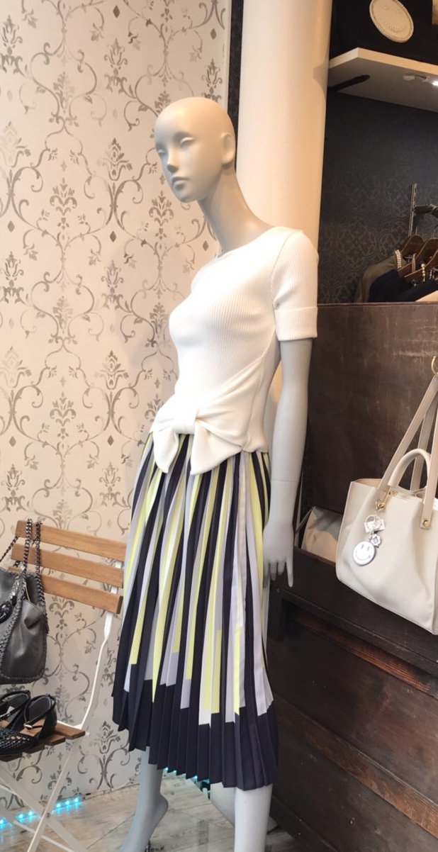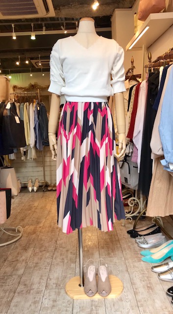 ジオメトリックプリーツスカート💕 14000円💕 大人気のプリントプリーツスカートが到着致しました💕😃🌸 揺れるプリーツがとっても春らしく華やかな印象です💕💕💕 お色違いはブルー系がございます 七分袖ニット 9900円 2019年4月2日