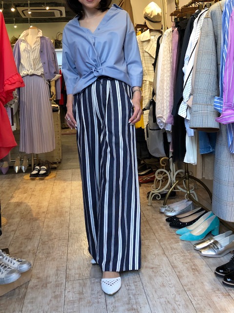 ストライプのワイドパンツ 💕 ネイビー❎ホワイトの爽やかなワイドパンツ が到着です💕😃 サックスブルーのシャツと合わせて、今年らしい色合わせにしてみました💕🌸 シャツ 7900円💕 シューズ 9000円💕 2019年4月2日