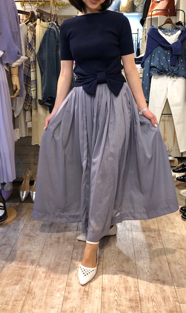 ラベンダー色のロングギャザースカート💕8900円💕 ふんわりと軽いポリエステル素材のギャザースカートの上半身にはぐっと引き締め感のあるネイビーのリボンニットを合わせてみました💕 ボリュームの出やすいギャザースカートはスッキリトップスを合わせると上手くいきますよぉ〜💕💕💕😍👌 リボンニット 11000円 2019年4月2日