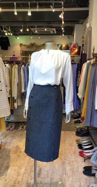 白ブラウスとタイトスカート💕 前に並んだくるみボタンがステキな長袖ブラウスとストレッチデニムスカートのコーディネートはいかがでしょう?😍 タイトなシルエットのスカートですが、伸縮素材とウェストゴムで、ダブルで楽チンなのです👌⭐️⭐️⭐️ ブラウス 13000円 スカート 13000円 2019年4月4日