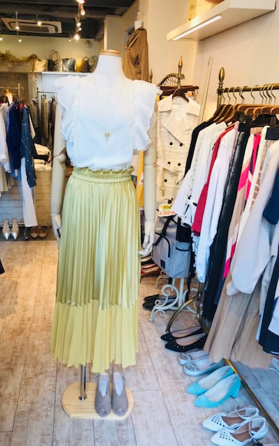 フリルのトップスとプリーツスカート💕 大人気のプリーツスカートを配色にして切り替えたお洒落なスカートが入荷しております💕 綺麗な春らしいイエローが魅力的ですよぉ〜😍 今週は新作が12型ほど入荷しております😆 ブログに載せきれないアイテムも多数ございますので、ぜひ見にいらしてくださいませーーー 自由が丘の🌸も大変綺麗です😃💕💕💕 2019年4月5日