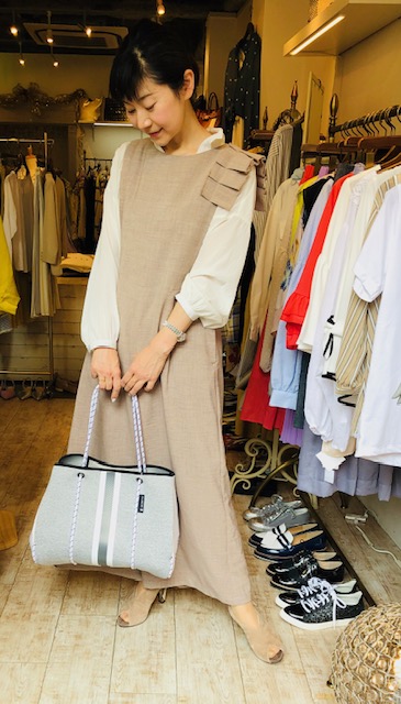 超軽量ウォッシャブルバック💕 ウエットスーツの素材で作られた超軽量トートバッグが入荷しました💕 濡れたものを入れてもへっちゃらで、かばんごと丸洗い出来ちゃうトートバッグです⭐️ 付属品として底板も付けて、荷物がスッキリと収まるようにしました👌😊 真ん中にはストライプの柄を入れて、オンリーワンのデザインとなっております⭐️ グレー、カーキ、ブラック、クリームの4カラーで入荷いたしました💕😆 トートバッグ 18000円⭐️⭐️⭐️ オールインワン 8900円 サンダル 17000円 2019年4月6日