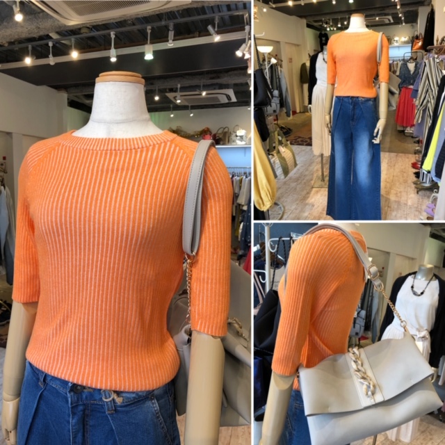 オレンジ色の5半袖ニット 7900円💕 とっても着やすいコットン素材のカラーニットです💕お色違いは、カーキ、ピンクがございます💕スッキリしたシルエットなので、ボトムスを選びません。今期のサロペットやジャンスカにもバッチリですよ 2019年4月12日