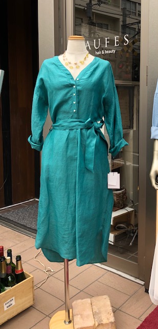 リネンワンピース グリーン💕 14000円 綺麗なグリーンのワンピースが大人気です💕😍本日追加の入荷です 上質なリネン素材の爽やかな着心地です💕 レギンスやスカートと重ね着してもお洒落😍 2019年4月18日