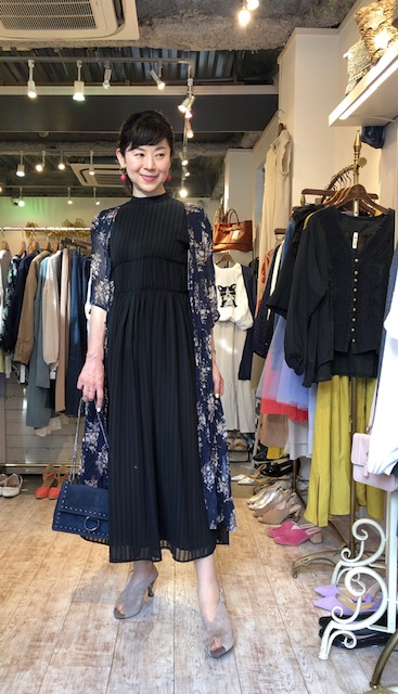 スタンドネックのワンピースとプリントロングガウン💕 大人気のスタンドネックのワンピースにフラワープリントのシフォンガウンをコーディネートしてみました💕シックなカラーのコーディネートなのでポイントにヒューシャピンクのイヤリングをつけてみました💕 快適なスエードのサンダルはベージュを合わせて、軽い感じに仕上げてみました💕 ダークカラーのコーディネートには、小物で明るいカラーを混ぜてみてくださいねーーー ワンピース 17000円 花柄ガウン 12000円 レザーバック 15000円 サンダル 17000円 イヤリング 4000円 ピアスもございます 2019年4月18日