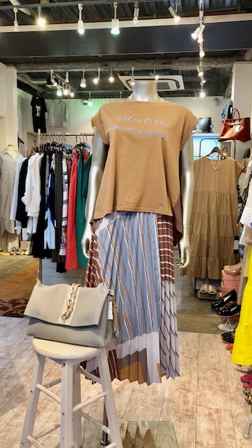 ベージュ❎サックスブルー系のコーディネート 今期の人気カラーに、ベージュやブラウンが入ってきてます💕👍 いつものトップスをベージュに変えるだけで、旬の着こなしっぽくなるのです😍 ぜひトライしてみてくださいねーー バック 5900円 カットソー 8600円 スカート 13800円 2019年4月25日