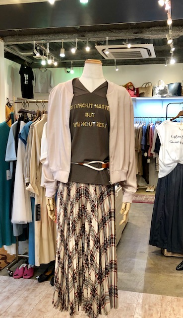 チェックプリーツパンツのコーディネート💕 お洒落なチェックのプリーツワイドパンツが到着しました💕お色違いは黄色にネイビーのチェックになります💕 ブルゾン 7900円 Tシャツ 8900円 プリーツパンツ 12800円 2019年4月25日