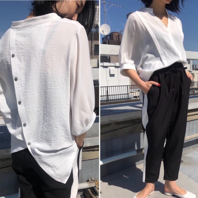 バックボタンのブラウス💕 9800円 身頃とお袖を切り替えたお洒落な七分袖のブラウスです☘️ 斜めに入ったボタンのデザインが素敵です💕どんなボトムスでも合わせやすい一枚ですよん お色違いでベージュとネイビーがございます😃 2019年5月6日