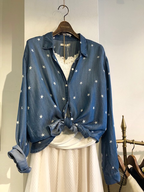 テンセル100%のシャツ 🇺🇸 9800円 アメリカ🇺🇸からインポートのお洒落な星プリントシャツは 上質なテンセル100%💕 S.M.Lの3サイズで入荷しております💕 日焼け避けにも、冷房避けにも長袖のシャツは重宝しまーす💕😊👌 2019年5月6日
