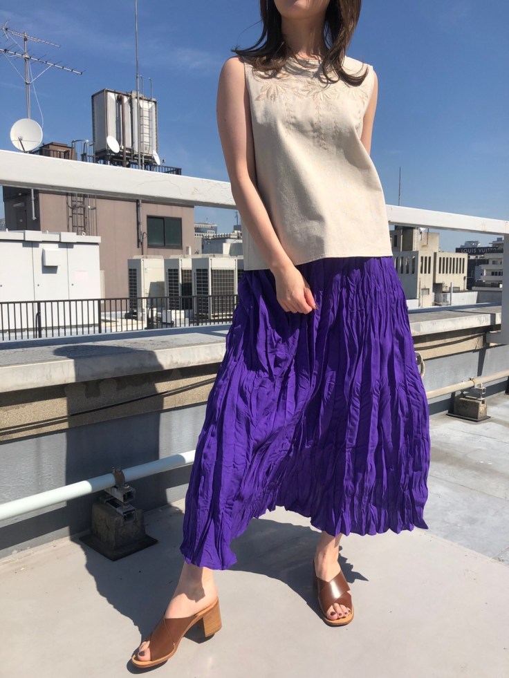 ワッシャー加工のスカート💕13000円 サラッと涼しい夏のスカートもこんなビビットなパープルはいかがでしょう?💕😃 ワッシャー加工は洗っても落ちませんのでご心配なくーーー👌 大人可愛い配色に仕上がります☺️👌 2019年5月6日