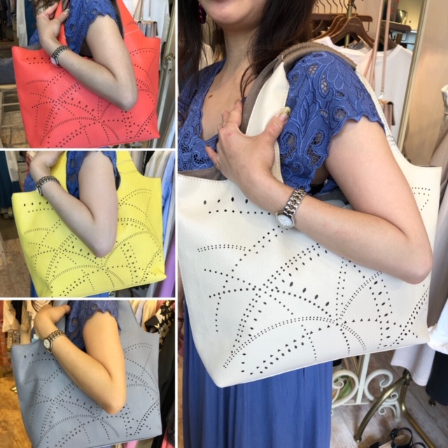 パンチングトートバック 5900円💕 超軽量の爽やかなトートバックが到着しました💕A4ファイルも楽々入って、肩に掛けた感じもソフトでしっくり馴染みます💕 ピンク、イエロー、グレー、オフホワイトの4カラー展開となっております😃 2019年5月18日