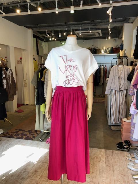 Tシャツとチェリーピンク色のスカート💕 大人気の刺繍Tシャツとチェリーピンク🍒のポリエステル素材の軽ーいスカートのコーデはいかがでしょう?😃 とにかく肌触りが良くて⭐️軽量で着やすいです⭐️⭐️⭐️ カラースカートでルンルンの初夏をお楽しみくださいねーーー Tシャツ 8900円 スカート 9800円💕 2019年5月18日