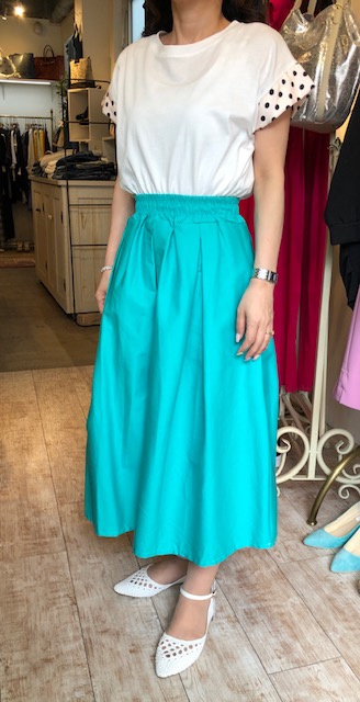 コバルトブルーのギャザースカート 6900円🇮🇹 綺麗なコバルトブルーがステキなギャザースカートは小柄さんでも着られるミディの着丈です👌スカートが長すぎてなかなか履けるのが無いのーーーーっ。とお困りの貴女におススメです👌💕身長の高い方が着ても、膝下の着丈になるので、やはり短めが良い方におススメです。 お色は他に、オレンジもございます🧡 モデル身長 150cm メッシュサンダル 9000円 2019年5月18日
