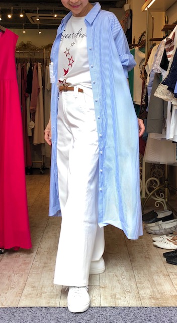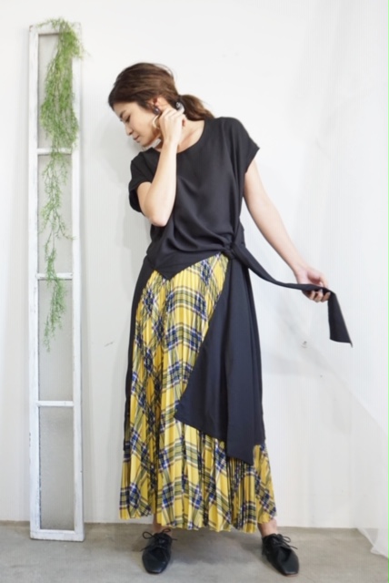 デザインTシャツ 9800円💕 大人気のプリーツワイドパンツとアシンメトリーなTシャツのコーディネートはいかがでしょう?長く伸びた片側のデザインで、びっくりするほど着痩せ効果を発揮します⭐️⭐️⭐️ 下半身をスッキリ見せたい方に是非トライして欲しい一枚です💕😊👍 Tシャツは、カミングスーンです💕 プリーツワイドパンツ 12800円💕 2019年5月24日