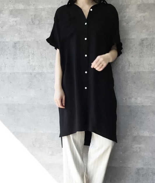 タックスリーブロングシャツ 11000円💕 レーヨン、ナイロン素材の爽やかなロングシャツが到着いたしました💕 前ボタンのデザインなので、サラッと羽織にもなるのが嬉しい😃 お写真の黒の他にオフホワイトも入荷いたしました💕 2019年5月28日