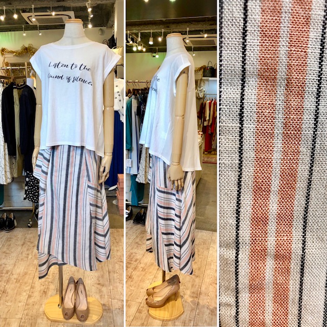 マルチストライプのスカート 7900円💕 マルチストライプスカートとデザインTシャツ💕 Tシャツ 8600円 スカート 7900円💕🎉 麻混の爽やかなストライプのスカートが到着しました💕お色違いで、イエローとグレーもございます😃真夏もサラサラーーーっの着心地ですよぉ〜 新作アイテム20型ほど入荷して参りました💕👍ワクワクのアイテムをお楽しみにです 2019年5月5日