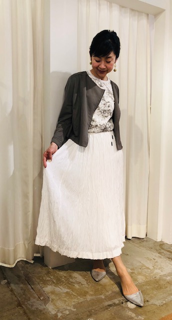 花柄トップスとライダースJK 💕 透けない白のスカートとシックな花柄のトップス、初夏のライダースブルゾンのコーディネートはいかがでしょう?☘️👗 夏はやっぱり白いスカートも一枚押さえておきたいところ👍ワッシャー加工のシンプルなスカートならフェミニン過ぎないから、足元はスニーカーでもGOODですよん⭐️ スカート 10800円 ジャケット 10800円 トップス 11000円 2019年5月5日
