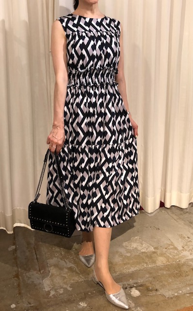 ジオメトリック柄のワンピース ⭐️ ネイビー❎ベージュ❎オフ白のジオメトリックワンピースはソフトなウェストのシャーリングでとっても着心地が良いワンピースです💕 メタリックのサンダルもとても相性が良いです👍😊 ワンピース 17000円 本革サンダル 9800円 スエードバック 15000円 フランスインポート🇫🇷 2019年5月5日