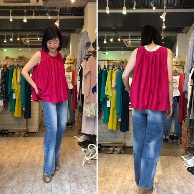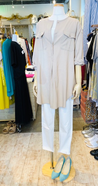丸首チュニックブラウス 12000円💕 こちらは真夏に涼しいレーヨンとリネンの混紡のチュニックブラウスです💕 細身のパンツで動きやすくスッキリした着こなしに⭐️ 白デニムも再入荷いたしました💕👍 2019年6月1日