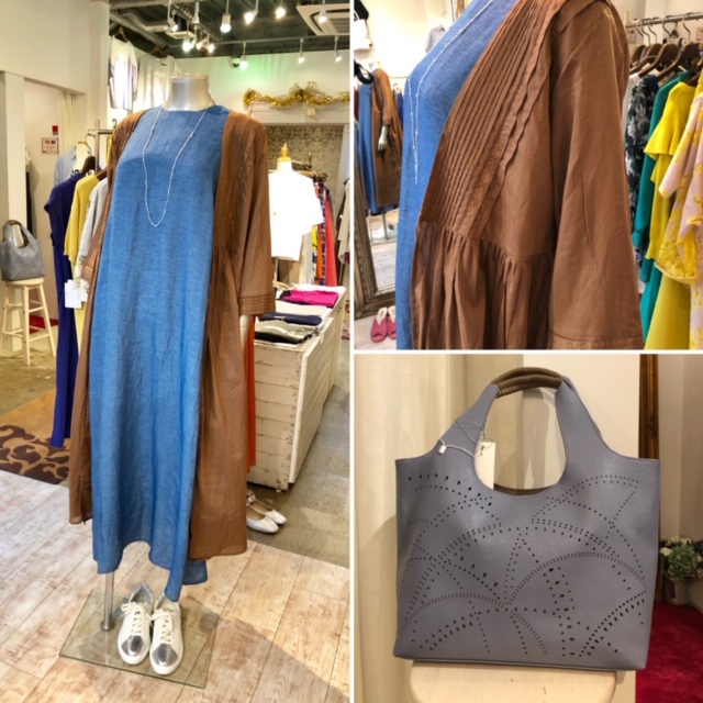 ダンガリーのワンピース 5900円💕 爽やかなダンガリーのワンピースにコットン素材のお洒落なトッパーを合わせたコーディネートです💕😃🙌 今季ジワジワとブラウンが人気カラーに上昇してます💕👍こんな薄ーいコットン素材なら真夏も大活躍しますよ☘️ 胸元の細かいピンタックで高級感もあり😍 お色違いは、チャコールグレーとオフホワイトがございます。 トッパー 6900円💕 超軽量バック 5900円💕 2019年6月5日