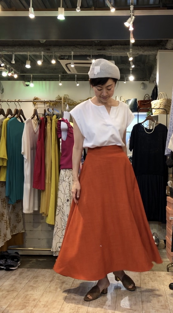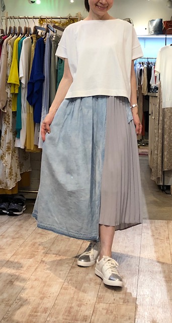 プリーツ❎テンセルデニム切り替えスカート💕 上質なテンセルデニムとプリーツシフォンをドッキングしたお洒落なスカートが到着しました💕ウェストはバックゴム仕様なので、ソフトにフィットして楽チンなスカートです💕 シンプルなTシャツでも、ブラウスでもバッチリ合いますよぉ〜😍 ボートネックカットソー 6900円💕 レザースニーカー 11800円💕 2019年6月11日