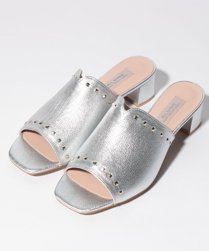 スタッズミュール 17000円💕🎉 アッパーにトッピングしたメタリックに輝くピラミッドスタッズが、足元をエッジーの彩るミュールサンダル。安定感のある高すぎないチャンキーヒールだから歩きやすく、デイリーユースにも活躍の予感🎉 お素材は山羊革スムース💕です 今週末に入荷します 2019年6月11日