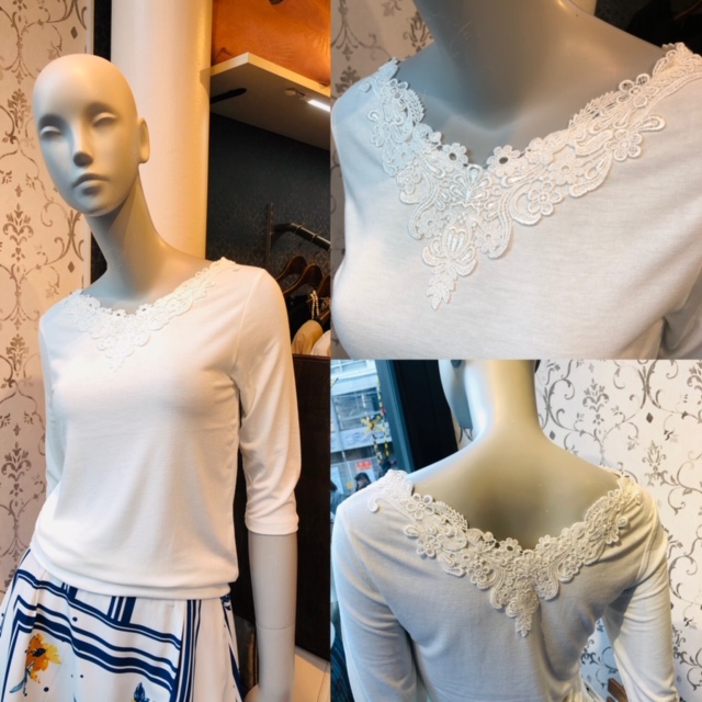 リコノオリジナルインナー 5900円💕 前後レースの七分袖のインナーカットソーが到着しました💕ブラウスだけじゃ肌寒い気温の日に、インナーにお召しになりますととっても快適⭐️⭐️⭐️なのです 今月中、こちらを20%オフにて販売させて頂きますーーー💕👍 ブラックも入荷いたしました💕 2019年6月14日