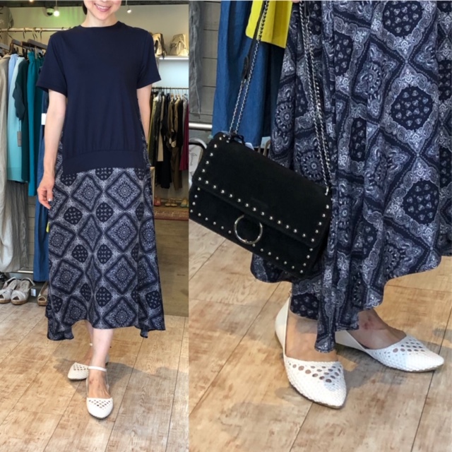 プリント切り替えワンピース 12800円💕 サラッサラーの生地が快適なプリントドッキングのワンピースが再入荷しました💕😍 一枚でストンと着てキマるから、忙しい貴女にオススメです💕 メッシュのフラットシューズも驚きの履きやすさ⭐️⭐️⭐️ご旅行にもピッタリです 2019年6月17日
