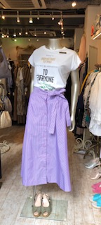 ラベンダーカラーのスカート 8900円💕 とっても爽やかなコットン素材のスカートはラベンダーのストライプ柄です💕😃 フロントのポタンと取り外し可能なリボンがポイントです💕イタリアのカットソーと合わせていかがでしょう? 2019年6月22日