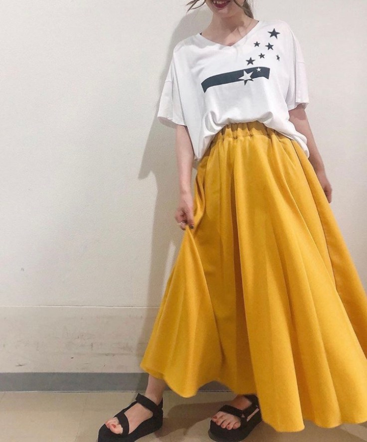 星のTシャツとマキシ丈のスカート💕 上質なポリエステル素材をふんだんに使ったフレアスカートが入荷して参りました💕🎉 シンプルなTシャツを合わせるだけで、とってもおしゃれに見える一品です💕😍 ウェストが総ゴムなのでゆったりした着心地もGOOD👍 スカートは、ミルクベージュ、ロイヤルブルーもございます スカート 11000円💕 2019年6月26日