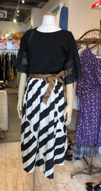プリントスカート 6860円💕 コットン素材の軽ーいスカートとお袖のレースが豪華なTシャツのコーデです💕🙌 Tシャツの生地が良いので、洗濯機で洗っても、まったくヨレませんーーーつ💕 まだまだ続く猛暑に一枚で着られるお洒落なトップスは必需品ですよぉ〜💕 お色違いは白がございます 袖レーストップス 6860円💕 2019年7月31日