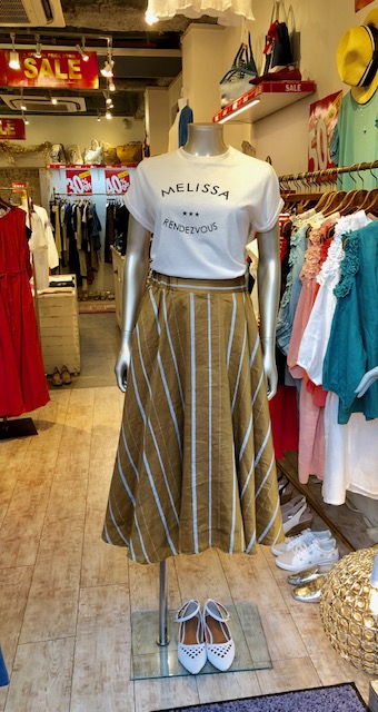 マルチストライプのスカート💕 お洒落なベージュとグリーンのマルチストライプのスカートが超特価です💕🤗 着やすいカットソーでサラッと合わせたスタイリングはいかがでしょう? スカートの高級感でワンランク上の着こなしを楽しめますよぉ〜💕 マルチストライプスカート 16000円→11200円💕 Tシャツ 6900円→4830円 2019年7月31日