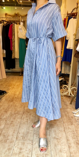 ストライプのシャツワンピース 7700円💕SALE 大人気のシャツワンピ💕サックスブルーにホワイトのストライプがとってもお洒落な一枚😍 素材は艶のあるコットン素材で、しなやかで落ち感のあるシルエットも◎です👍 2019年7月2日