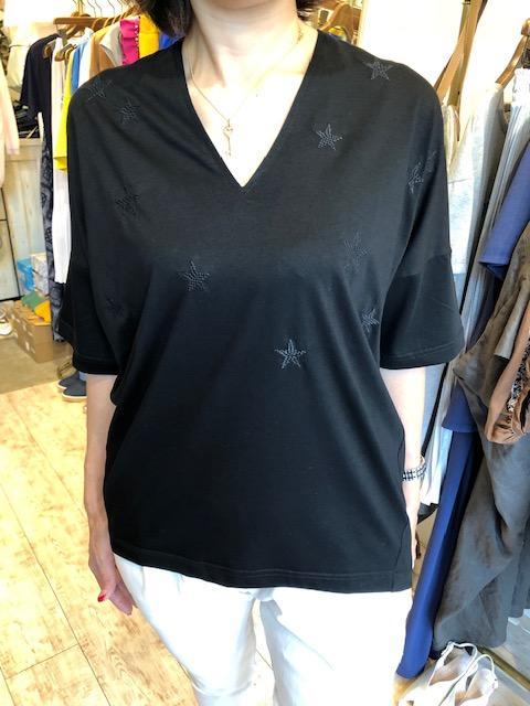 星のTシャツ 4130円😍 お洒落な星の刺繍と、スッキリしたVネックがお洒落なTシャツが再入荷しました💕 少し長めの5分袖でしなやかなコットン生地なので肌触りも良いです💕 刺繍無しのタイプもございます💕 2019年7月2日