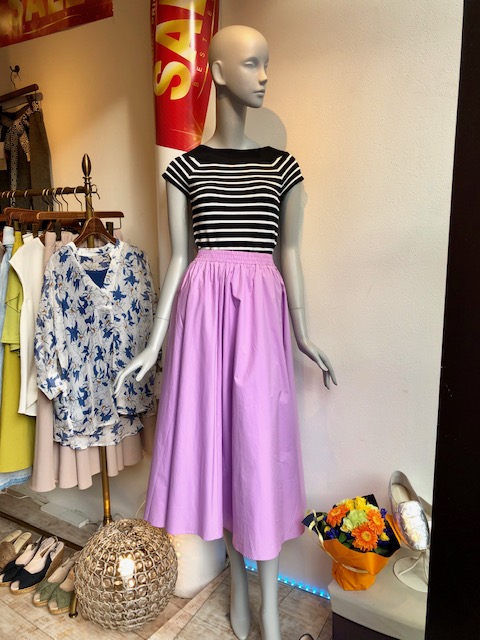 ピンクのスカートとボーダーニット💕 コンパクトなシルエットがステキなボーダーサマーニットとフレアスカートの組み合わせです💕スカートが長すぎないのがGOOD💕 お色違いはアップルグリーン☘️がございます 2019年7月9日