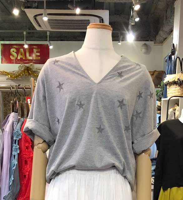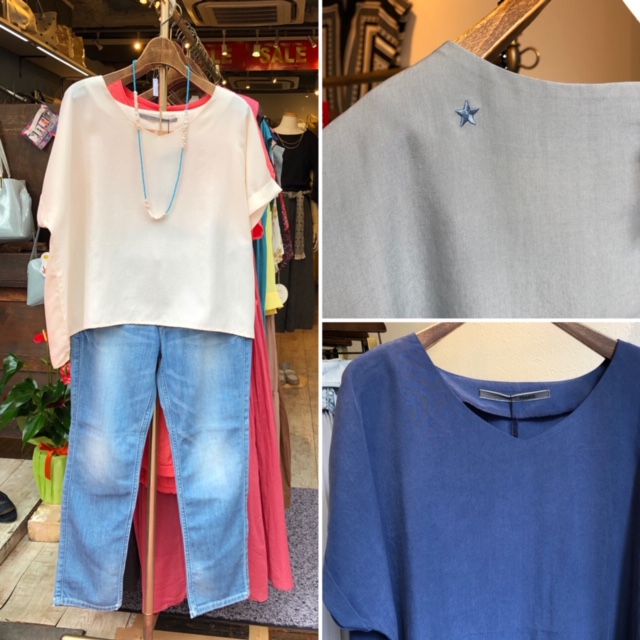 肩に星刺繍のトップス 30%オフ💕🎉 しなやかなとろみ素材と肩の刺繍がお洒落なトップスがとってもお得になりました🎉🎉🎉 アイボリー、サックスブルー 、ティーベージュ、ブルー、グレーの5カラーとなっております😃🙌 トップス 6900円→4830円💕 2019年7月10日