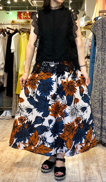 大花柄のスカート💕🎉SALE 華やかな花柄がステキなフレアスカートが到着しました💕🎉ウエスト周りを細く見せてくれる優秀なデザインではき心地が楽チン💕💕 文句なしのスカートです😍 ブラウス 9800円→6860円 スカート 9800円→6860円 サンダル 9800円💕 2019年7月14日