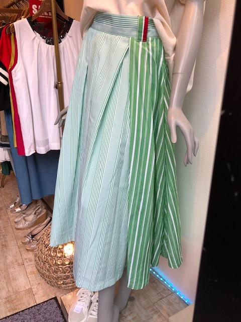 グリーンのストライプ切り替えスカート💕 こちらのグリーンのスカートは何と30%オフ💕で入荷しました😆 イエロー、ブルー、ベージュ、グリーンの4カラーとなっております 13800円→9660円💕💕💕 2019年7月15日