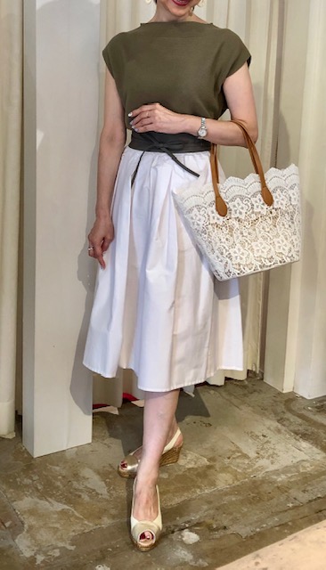 カーキ❎白コーデ💕 こちらはミドル丈のコットンスカートとサマーニットのコーデです💕 イタリア🇮🇹から届いたコットン素材のスカートはポケットもついていてとっても履きやすい一枚💕お色違いでエメラルドグリーンもございます スカート 4830円💕 サンダル 10800円💕 レースバック 4900円🎉 2019年8月2日