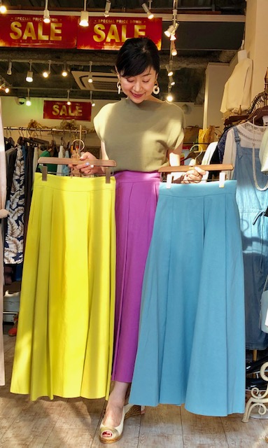 ブライトカラーのセミフレアスカート💕30%オフ🎉 これから晩夏にかけてお役立ちのセミフレアスカートが特別価格で入荷しました💕🎉😍 秋のトレンドブラウンとの相性もバッチリの3カラーです⭐️⭐️⭐️👌 ウェストはとっても楽チンなゴム仕様で涼しいですよぉ〜😃 各一枚の入荷となっております。 カラースカート 12000円→8400円💕 2019年8月3日