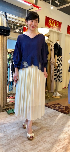 ネイビー❎アイボリーコーデ💕 毎日暑いですねぇーーー💦💦 こんな暑い時にはやっぱり白っぽいのが着たくなります💕😍そこで本日はアイボリーのロングスカートとネイビーのバティックレースブラウスのコーデにしてみました💕 アイボリーのスカート 超特価の4830円🎉⭐️😍シワになりにくいのでご旅行にもバッチリですよぉ〜 2019年8月3日