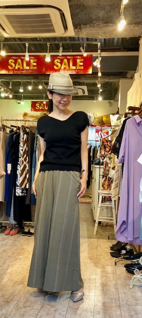 カーキ色のストライプワイドパンツ セール💕 シックなカーキ色のワイドパンツがとってもお得になりました💕😍🙌 綿麻素材でとっても涼しいパンツですよぉ〜💕 ワイドパンツ 6230円 ニット 5530円 2019年8月3日
