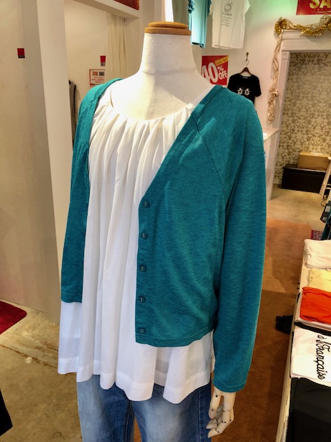 白ブラウスにグリーンのカーディガン💕 50%オフ🎉😍で大人気の白のギャザーブラウスに新作のピーコックグリーンのカーディガンを合わせました💕 カーディガンは、後ろが少し長めのデザインになって、スッキリしたシルエットです☘️👌 他にクリームイエロー、ブラックがございます😃 カーディガン 8100円→5670円💕 ブラウス 6900円→3450円💕 2019年8月6日